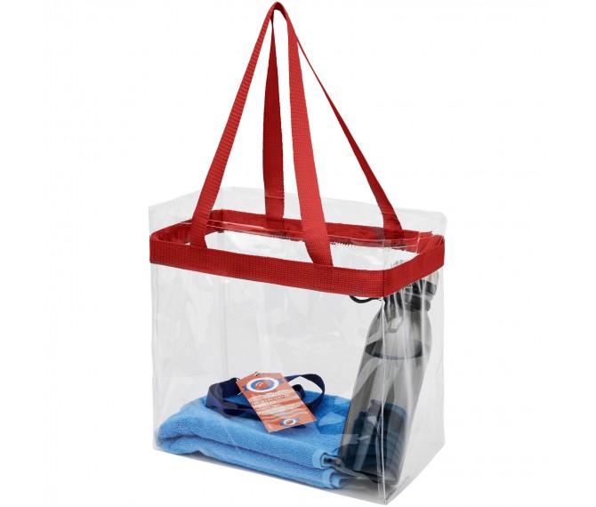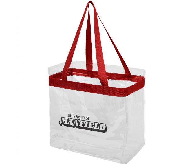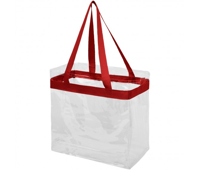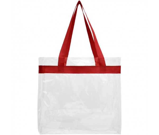 Transparante draagtas, perfect voor een middag in het stadion, een dagje op een festival of gewoon voor werk of school. Open hoofdvak met sportieve gaasrand en dubbele hengsels. Draaghoogte 27 cm. Accessoires niet inbegrepen. Geschikt tot 10 kg gewicht.