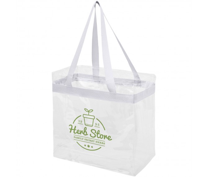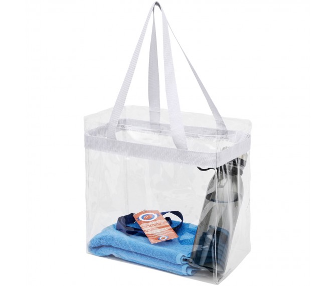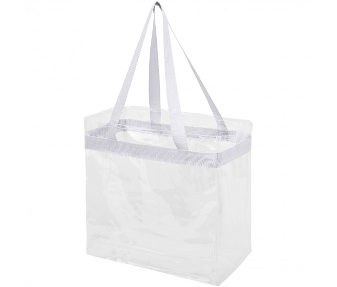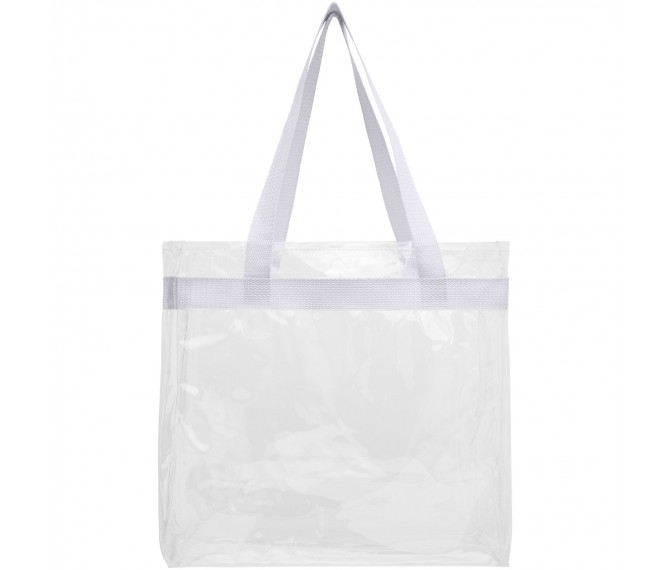 Transparante draagtas, perfect voor een middag in het stadion, een dagje op een festival of gewoon voor werk of school. Open hoofdvak met sportieve gaasrand en dubbele hengsels. Draaghoogte 27 cm. Accessoires niet inbegrepen. Geschikt tot 10 kg gewicht.