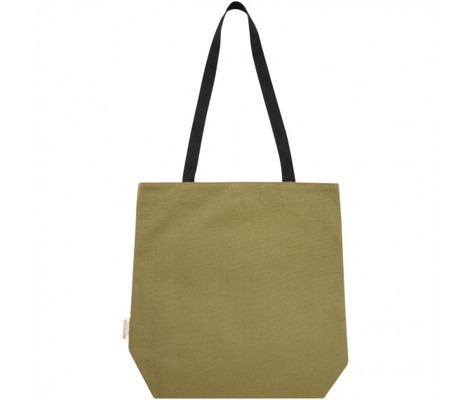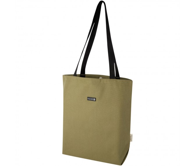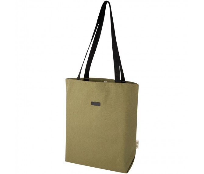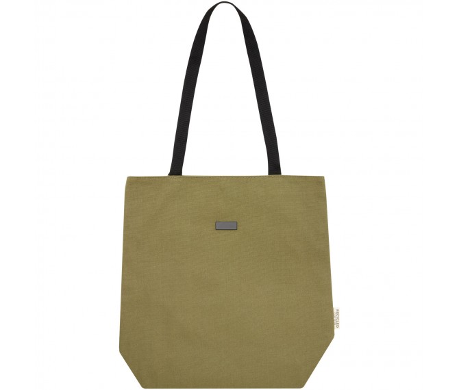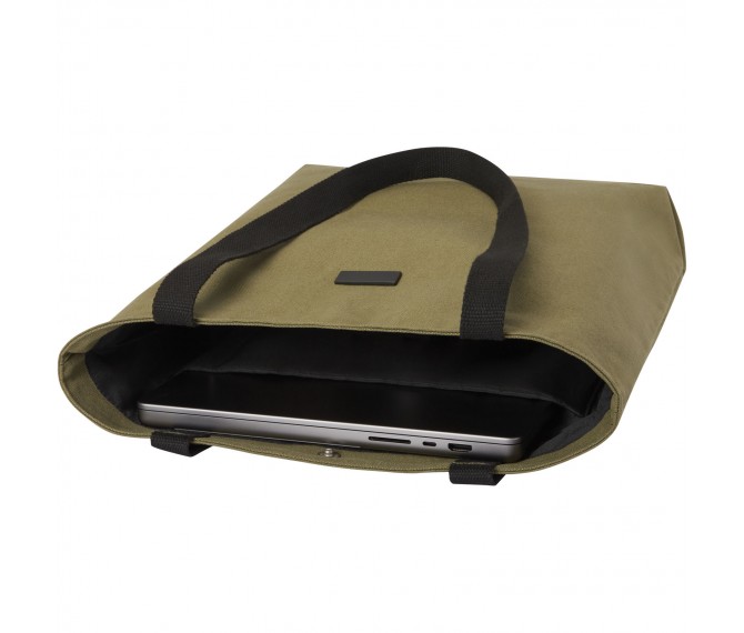 Draagtas van GRS-gecertificeerd gerecycled canvas en GRS-gecertificeerde RPET-voering. Deze veelzijdige draagtas heeft een gewatteerd 15" laptopvak en twee sleufvakken aan de binnenkant voor een telefoon, portemonnee of accessoires, een gemakkelijke knoopsluiting bij de opening en comfortabele katoenen handgrepen. Het decoratieve metalen plaatje kan een logo laten opvallen door de subtiele en matte afwerking.