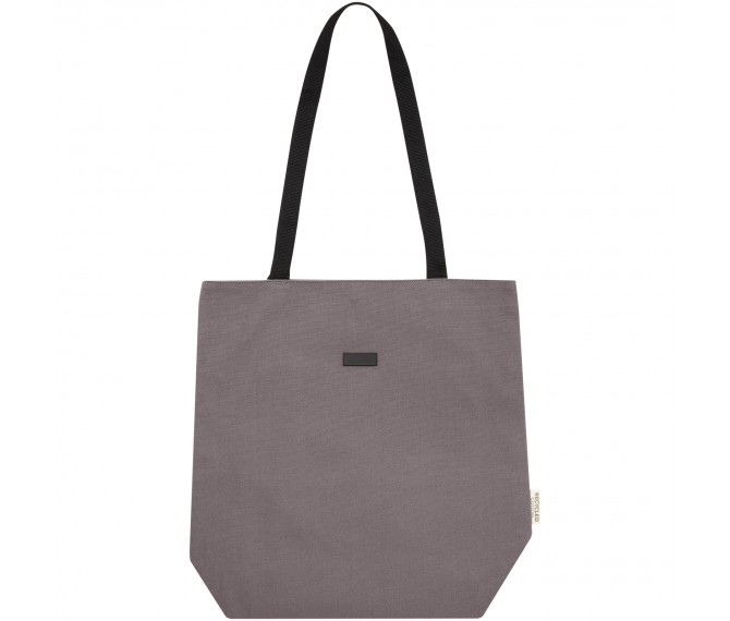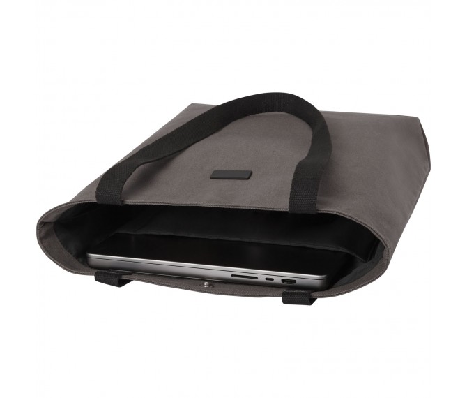 Draagtas van GRS-gecertificeerd gerecycled canvas en GRS-gecertificeerde RPET-voering. Deze veelzijdige draagtas heeft een gewatteerd 15" laptopvak en twee sleufvakken aan de binnenkant voor een telefoon, portemonnee of accessoires, een gemakkelijke knoopsluiting bij de opening en comfortabele katoenen handgrepen. Het decoratieve metalen plaatje kan een logo laten opvallen door de subtiele en matte afwerking.