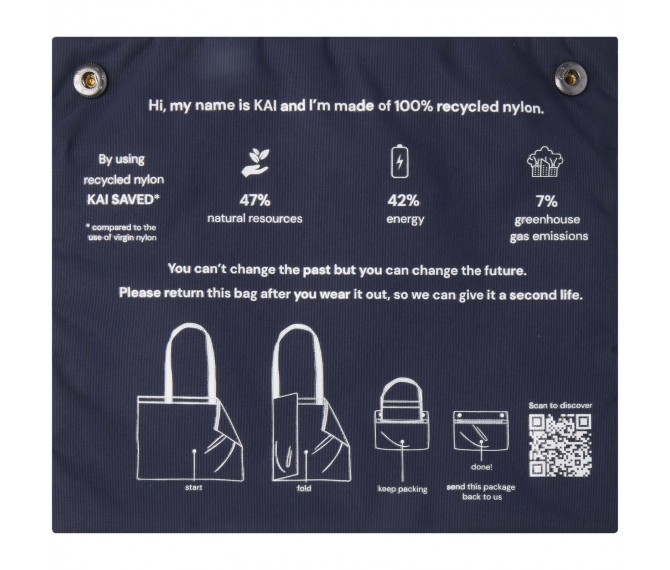 De Kai GRS gerecyclede circulaire draagtas - een toonaangevend product op het gebied van milieuprestaties. Circulair en duurzaam design begint met slimme keuzes: een ontwerp dat de impact op het milieu minimaliseert. Deze tas realiseert al aanzienlijke impactverminderingen: 7% minder koolstofvoetafdruk, 42% minder energieverbruik en 47% lagere milieukosten. De Kai is vervaardigd van 200T GRS-gecertificeerd gerecycled nylon en biedt een klassieke, tijdloze stijl die perfect is voor dagelijks gebruik. De tas heeft een speciaal bedrukkingsgebied op de zak, die tevens als etui kan worden gebruikt. Bovendien kan de tas worden ingeleverd via een retourprogramma met een QR-code voor extra informatie.