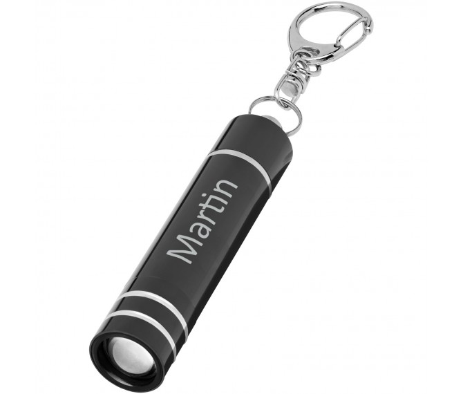 Handige sleutelhanger met ledlamp met zowel zaklamp- als lichtfunctie. De witte ledlamp genereert vijf lumen en wordt bediend met een drukknopschakelaar. Trek de houder naar buiten voor extra licht. Wordt geleverd met een metalen karabijnclip voor eenvoudige bevestiging aan een tas of sleutelbos. Batterijen inbegrepen.