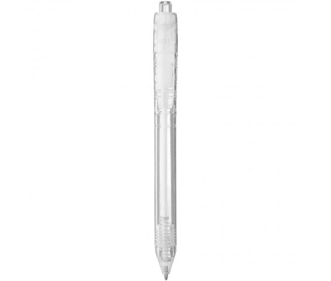Balpen met klikmechanisme met een transparante huls. Het huls is gemaakt van gerecyclede waterflessen, wat bijdraagt aan het verminderen van de hoeveelheid plastic afval.