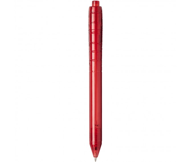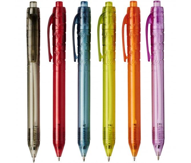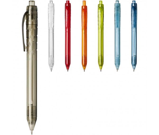 Balpen met klikmechanisme met een transparante huls. Het huls is gemaakt van gerecyclede waterflessen, wat bijdraagt aan het verminderen van de hoeveelheid plastic afval.