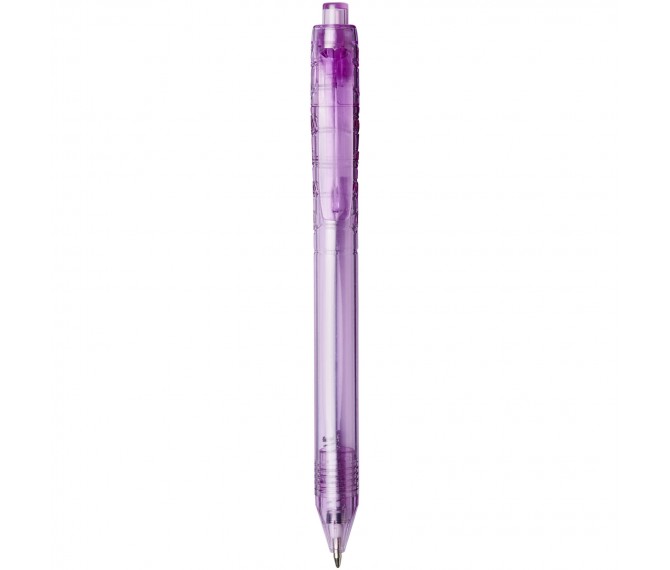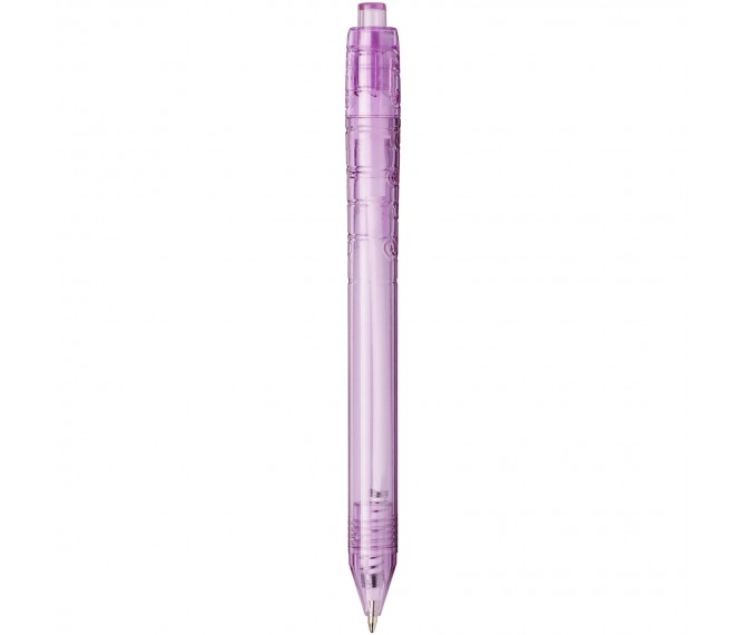Balpen met klikmechanisme met een transparante huls. Het huls is gemaakt van gerecyclede waterflessen, wat bijdraagt aan het verminderen van de hoeveelheid plastic afval.