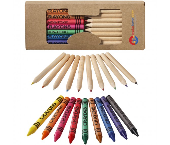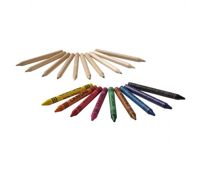 Set van 9 waskrijtjes en 10 kleurpotloden in kartonnen doos met kunststof venster. Decoratie is niet mogelijk op de losse onderdelen.