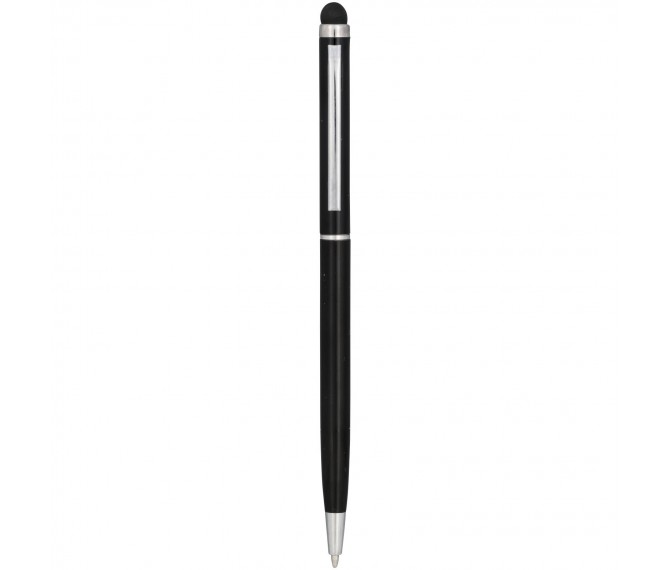 Slank vormgegeven balpen van aluminiumglazuur. Met draaimechanisme en stylus.