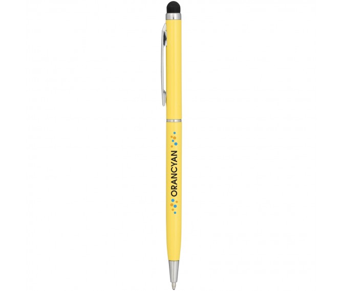 Slank vormgegeven balpen van aluminiumglazuur. Met draaimechanisme en stylus.