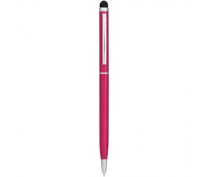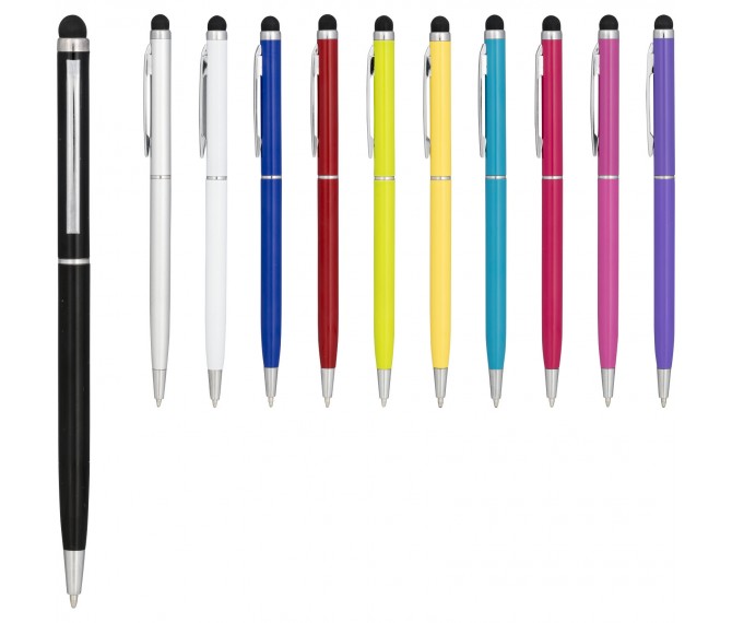 Slank vormgegeven balpen van aluminiumglazuur. Met draaimechanisme en stylus.