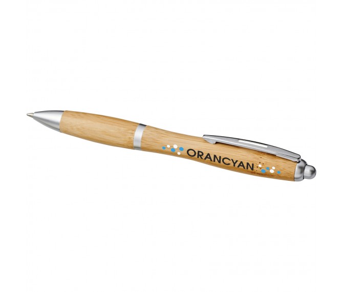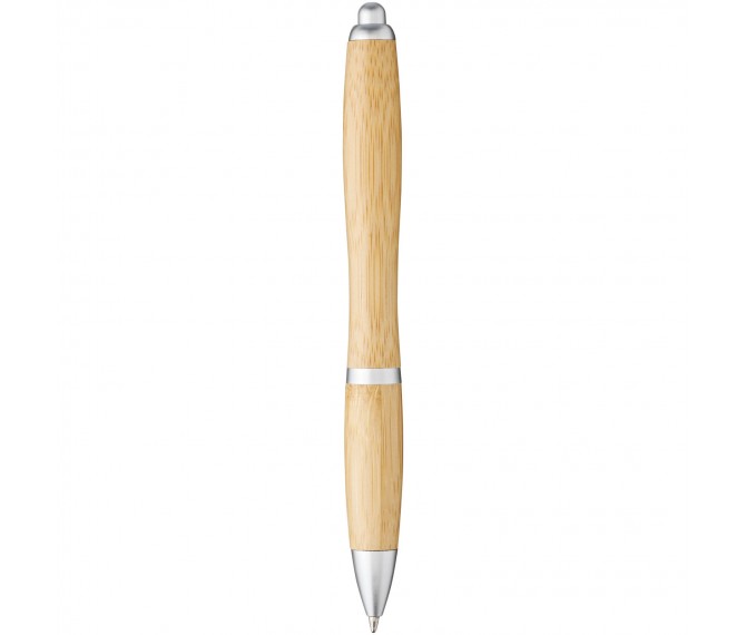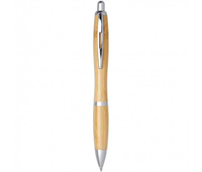 Balpen met klikmechanisme, met een huls van bamboe, geaccentueerd door een verchroomde clip en ABS kunststof sierranden. De kleur van het bamboemateriaal kan variëren.