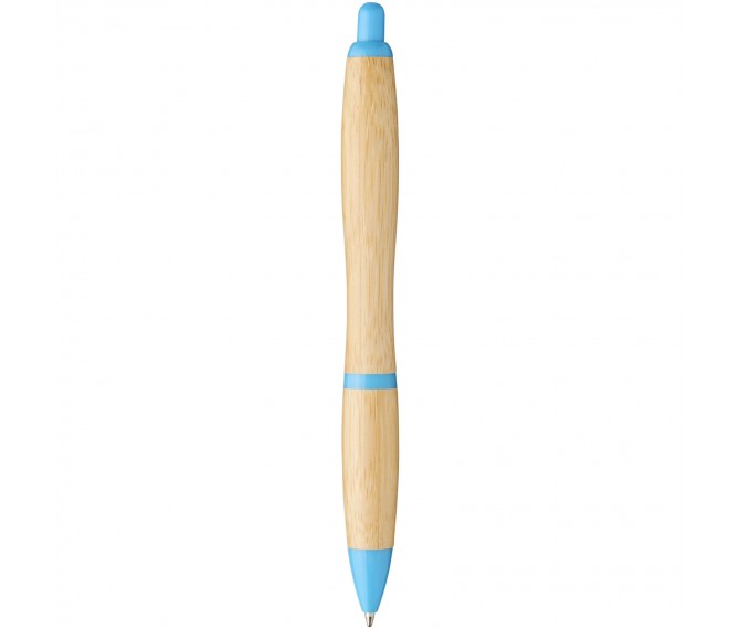 Balpen met klikmechanisme, met een huls van bamboe, geaccentueerd door een verchroomde clip en ABS kunststof sierranden. De kleur van het bamboemateriaal kan variëren.