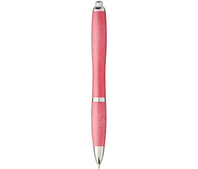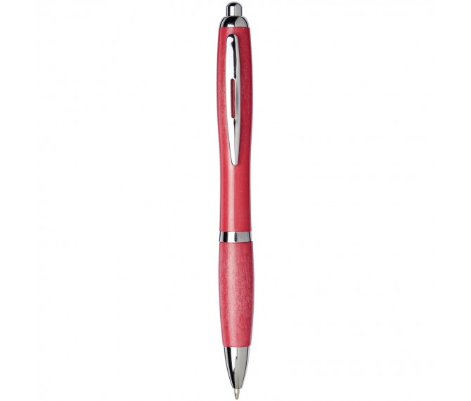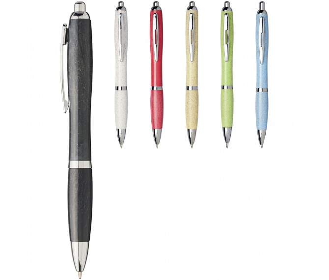 Balpen met klikmechanisme, met een huls van tarwestro en afgewerkt met opvallende chroomkleurige details. Na het oogsten van de tarwekorrels blijft er tarwestro over, waardoor er minder plastic wordt gebruikt.