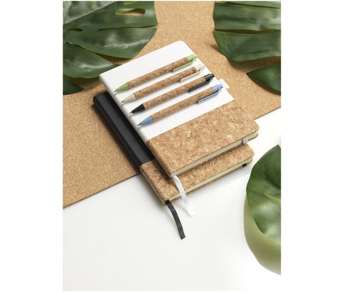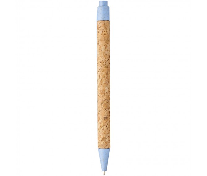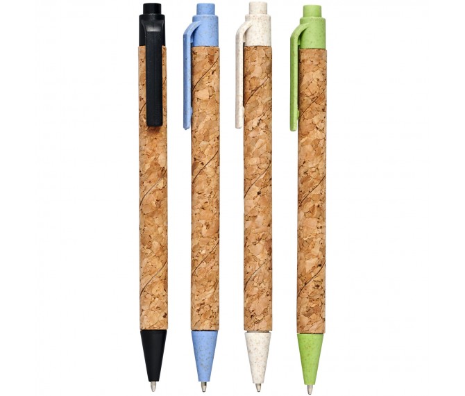 Ecovriendelijke balpen met klikmechanisme, met een huls van kurk en tarwestrostro in verschillende kleuren. Tarwestro blijft over na het oogsten van de tarwekorrels. Dit vermindert het gebruik van plastic, wat een milieuvriendelijk alternatief biedt. De kleur van het kurkmateriaal kan variëren.