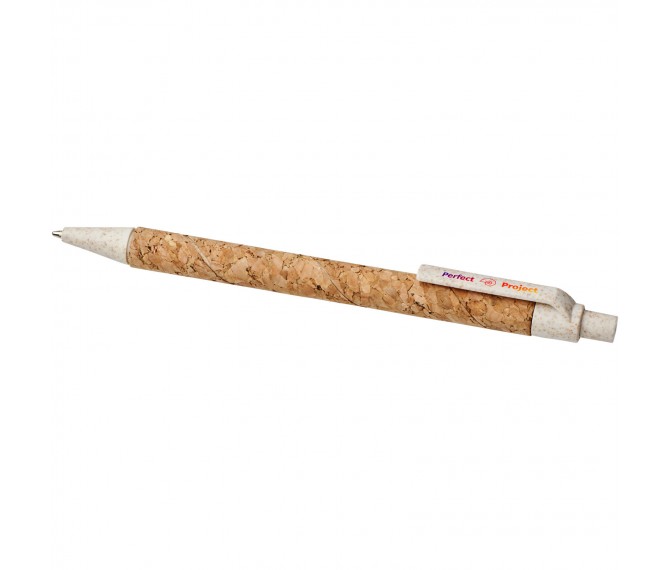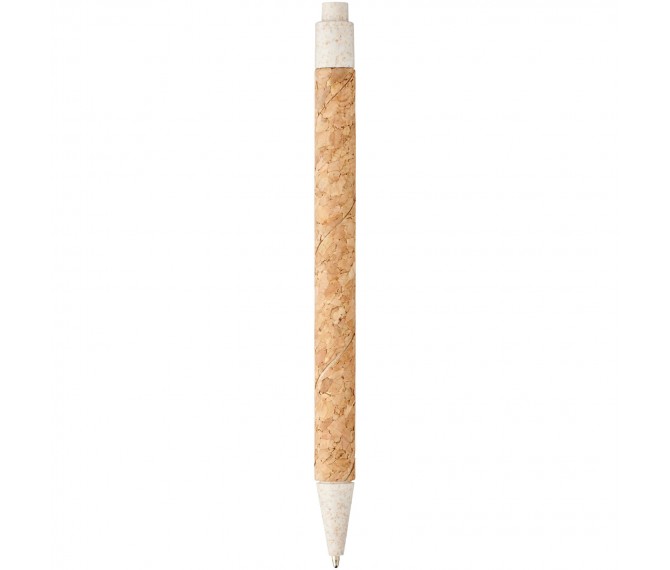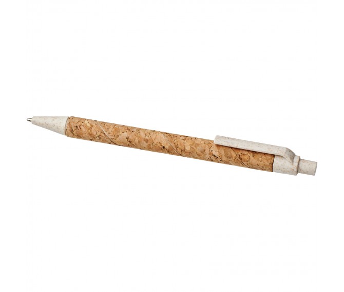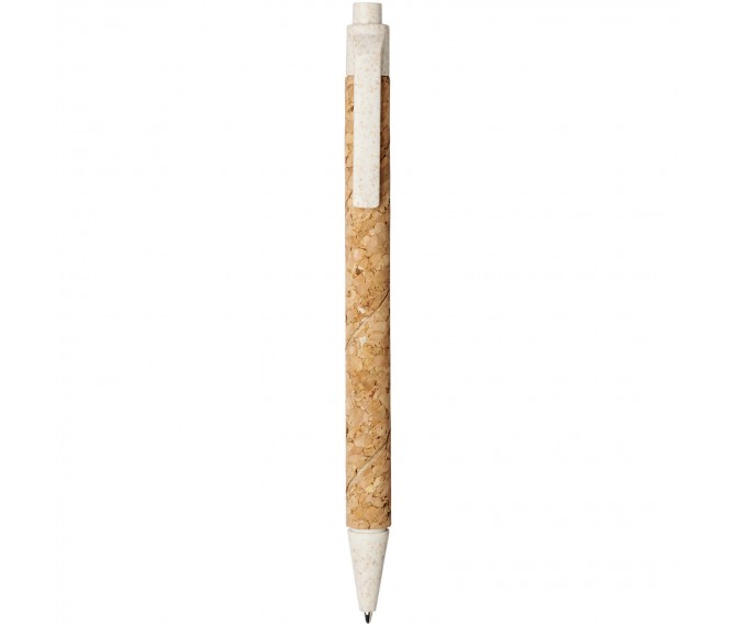 Ecovriendelijke balpen met klikmechanisme, met een huls van kurk en tarwestrostro in verschillende kleuren. Tarwestro blijft over na het oogsten van de tarwekorrels. Dit vermindert het gebruik van plastic, wat een milieuvriendelijk alternatief biedt. De kleur van het kurkmateriaal kan variëren.