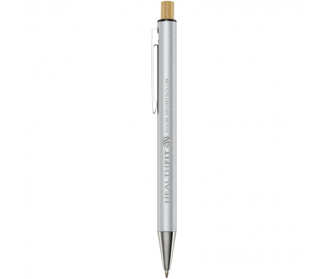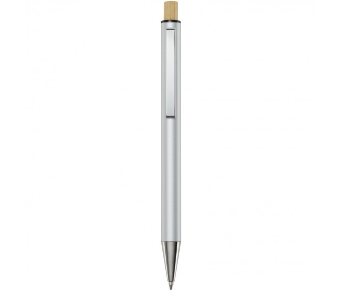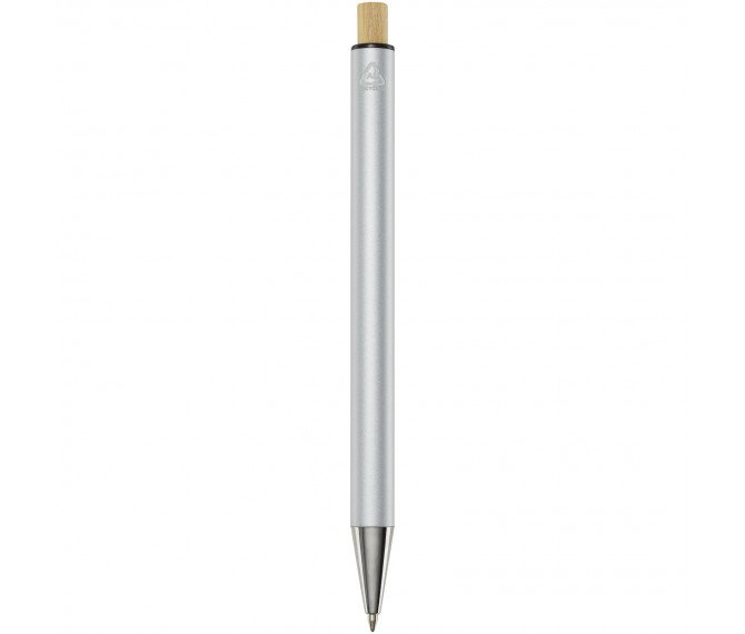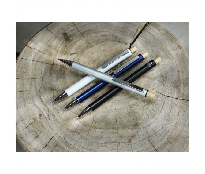 De Cyrus balpen is gemaakt van gerecycled aluminium, waardoor minder energie nodig is dan bij het produceren van aluminium uit grondstoffen. Het vermindert ook de hoeveelheid afval op stortplaatsen en draagt bij aan het behoud van natuurlijke hulpbronnen met als doel de uitstoot van broeikasgassen te beperken. De drukknop is gemaakt van bamboe. Inktkleur: Blauw. Schrijflengte: 800 meter. Stiftmaat: 1,00 mm.