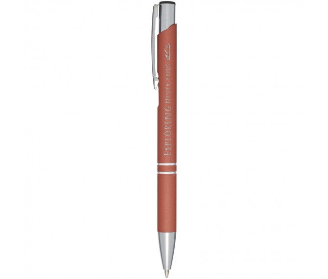 De rubberen coating geeft de pen een zachte touch, en zodra de zilveren onderlaag van de pen met een laser gegraveerd is, wordt de zilveren onderlaag van de pen zichtbaar. Balpen met klikmechanisme met zwarte rubberen coating en verchroomde afwerking en zwarte ABS bovenkant. Het uitgebreide en populaire Moneta-assortiment is verkrijgbaar in vele verschillende stijlen en afwerkingen.