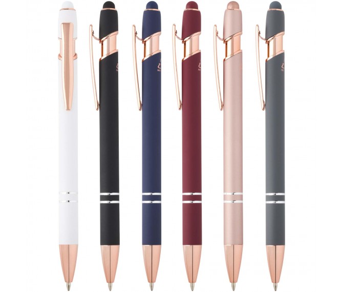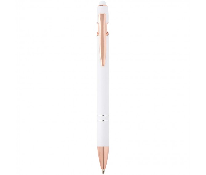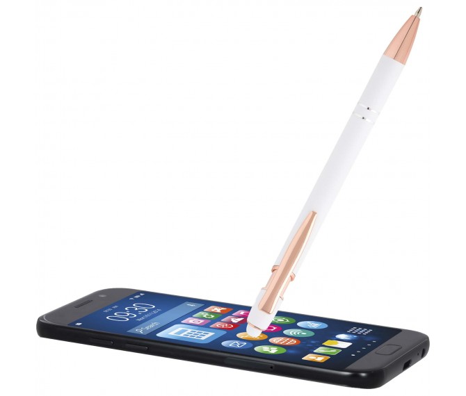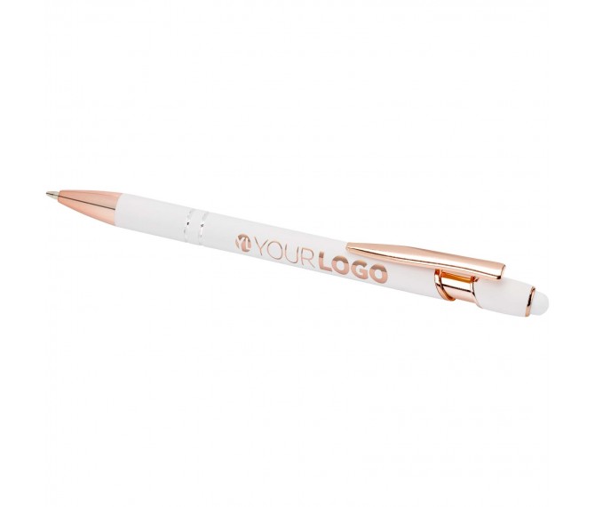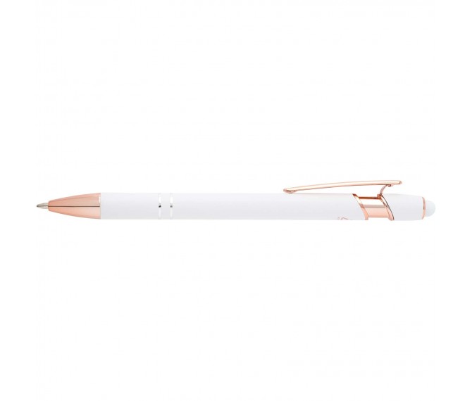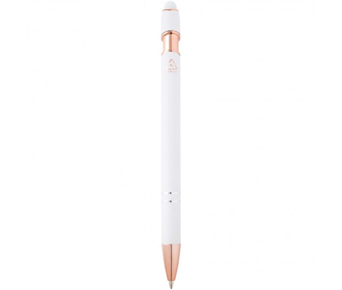 De Nanna balpen met roségouden afwerking heeft een houder van gerecycled aluminium met een siliconen touch stylus. Gerecycled aluminium vermindert de hoeveelheid afval op stortplaatsen en draagt bij aan het behoud van natuurlijke hulpbronnen, met als doel de uitstoot van broeikasgassen te verminderen. Inktkleur: zwart. Schrijflengte: 800 meter. Stiftmaat: 1,0 mm.