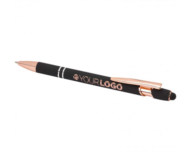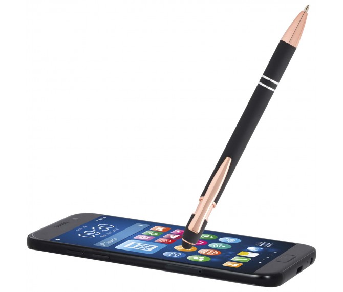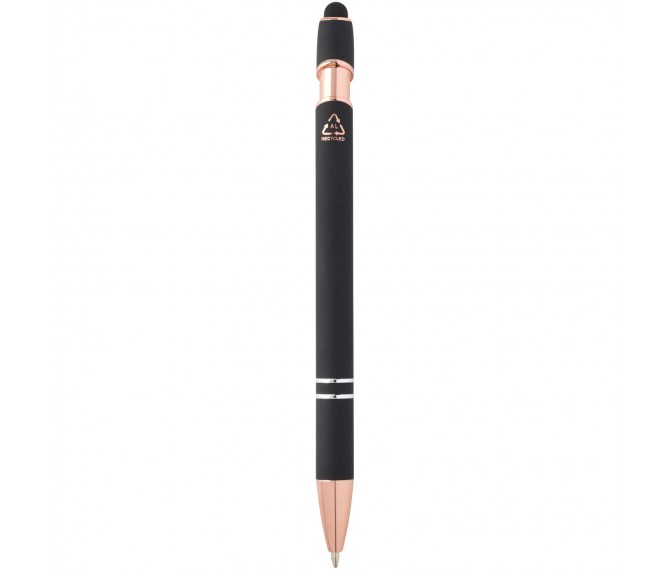 De Nanna balpen met roségouden afwerking heeft een houder van gerecycled aluminium met een siliconen touch stylus. Gerecycled aluminium vermindert de hoeveelheid afval op stortplaatsen en draagt bij aan het behoud van natuurlijke hulpbronnen, met als doel de uitstoot van broeikasgassen te verminderen. Inktkleur: zwart. Schrijflengte: 800 meter. Stiftmaat: 1,0 mm.