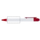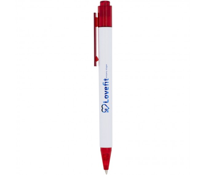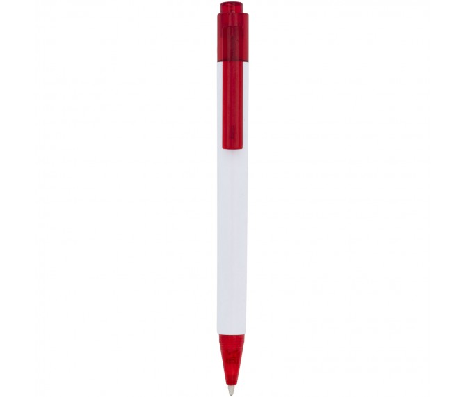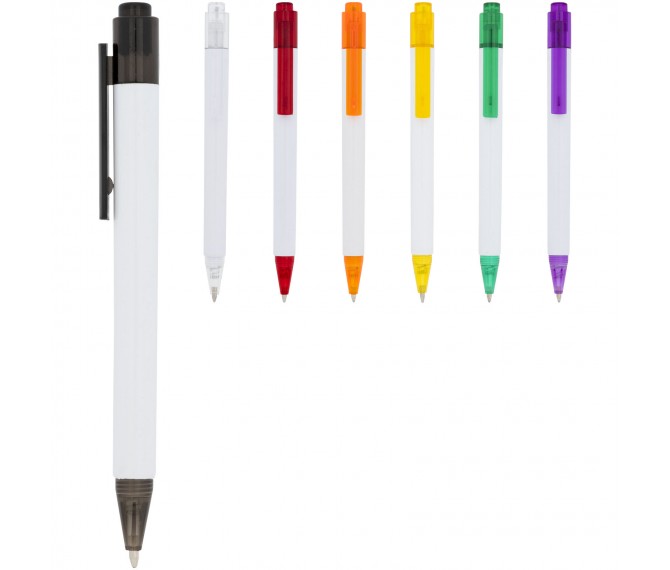 De Calypso-balpen heeft een gladde, witte greep met een doorschijnende gekleurde punt en clip.