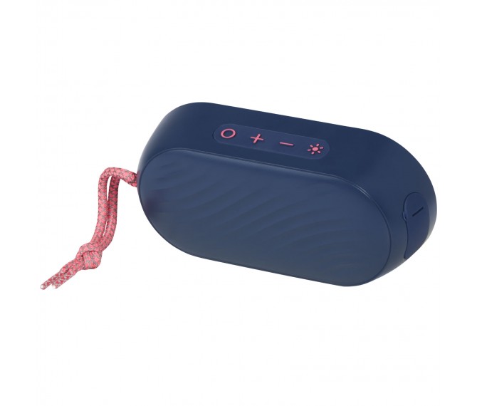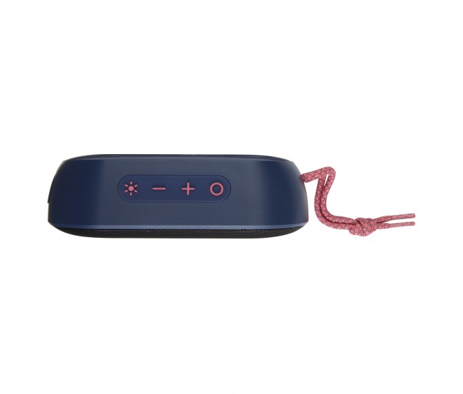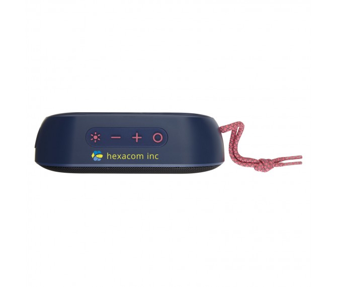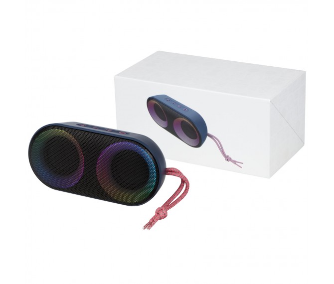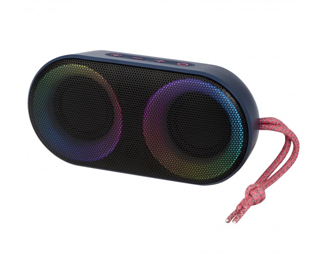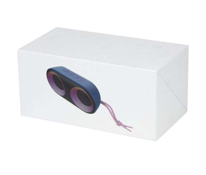 Krachtige 7 W IPX6 gecertificeerde draadloze speaker met RGB sfeerlicht die perfect is voor buitenactiviteiten zoals een picknick, barbecue en strand- of zwembadfeest. De ingebouwde batterij van 1500 mAh zorgt voor een afspeeltijd tot 4 uur op maximaal volume met RGB sfeerlicht aan. Bluetooth® 5.1 met afstand tot 10 meter. Ingebouwde microfoon, ophaalfunctie en spraakassistent voor handsfree bediening. De speaker heeft een AUX-aansluiting en een TF-kaartsleuf (kaart niet inbegrepen). Geleverd in een geschenkverpakking.
