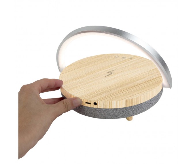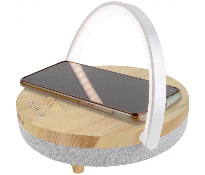 Dit item heeft 4 verschillende functies: Een draadloze Bluetooth®-speaker, een draadloze oplaadstation, een ledlamp met 3 instelbare helderheidsniveaus en een mobiele telefoonhouder. Dankzij de multifunctionele functie kun je genieten van je favoriete muziek terwijl je je telefoon oplaadt. Geleverd met een type-C-oplaadkabel en een aux-kabel.