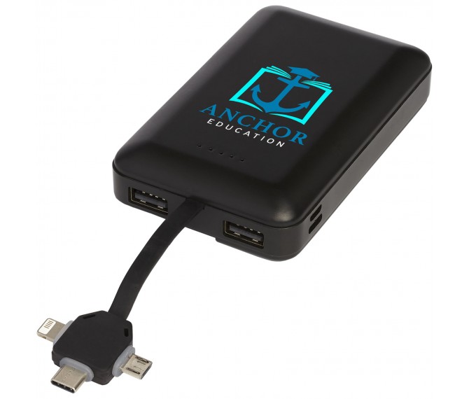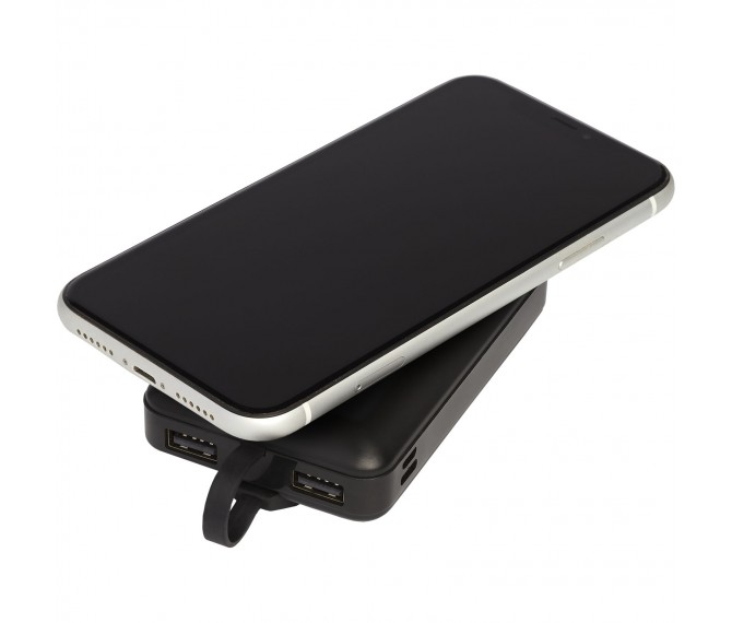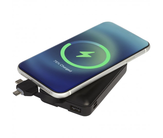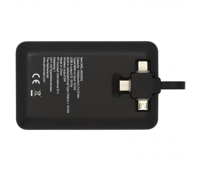 Draadloze powerbank met 3-in-1 universele kabel en een 10,000 mAh Grade-A lithium-polymeerbatterij, draadloze oplaadzender en een 3-in-1 geïntegreerde kabel. Apparaten kunnen worden opgeladen door middel van draadloos opladen, of met de geïntegreerde 3-in-1-kabel. De 3-in-1-kabel is compatibel met zowel Apple® iOS- als Android-apparaten. Geen accessoirekabel meegeleverd vanwege duurzaamheidsdoeleinden. Geleverd in Avenue-geschenkverpakking.