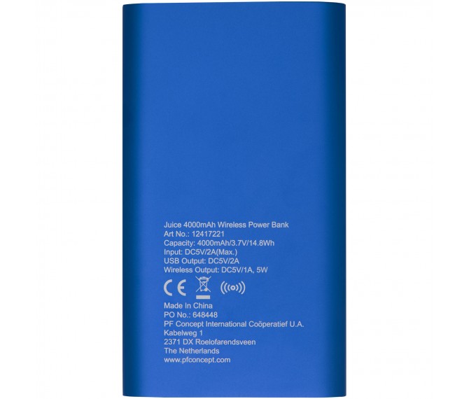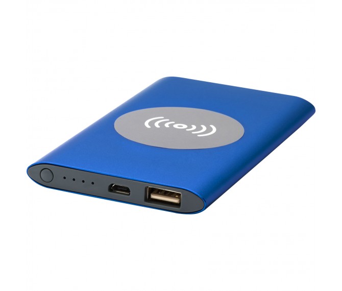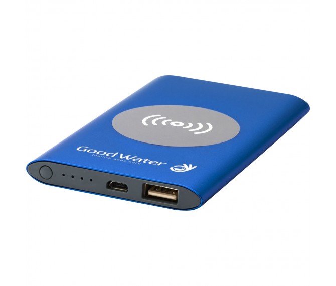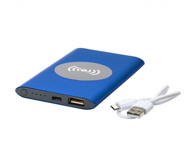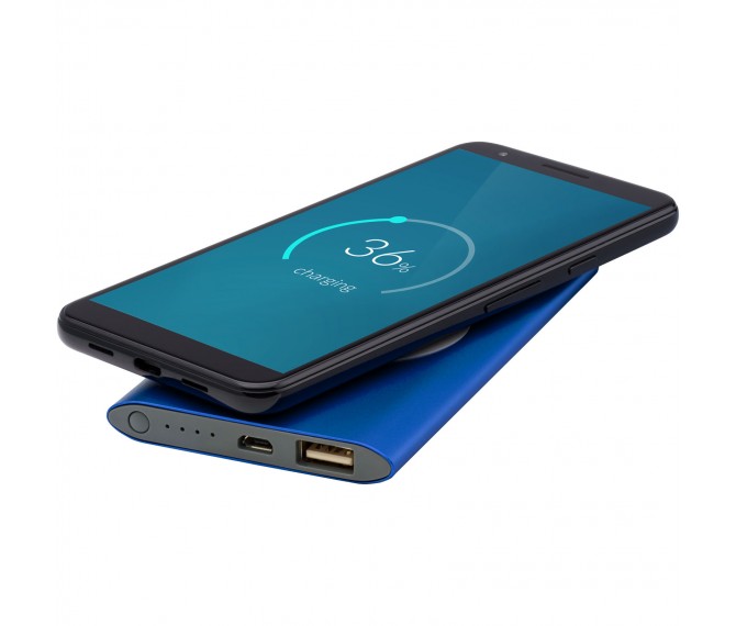 4000 mAh powerbank met aluminium behuizing. Ondersteunt 5 W draadloos opladen en wordt ook geleverd met Micro USB-uitgang om te kunnen opladen met een kabel. Met de lithiumpolymeerbatterij van 4000 mAh kan hij een smartphone volledig opladen. Powerindicator die te allen tijde het energieniveau weergeeft. Micro USB-ingang: 5 V/2 A-uitgang: 5 V/2A. Draadloze uitgang 5 W. Inclusief PVC-vrije TPE kunststof oplaadkabel. Geleverd in een standaardgeschenkverpakking.