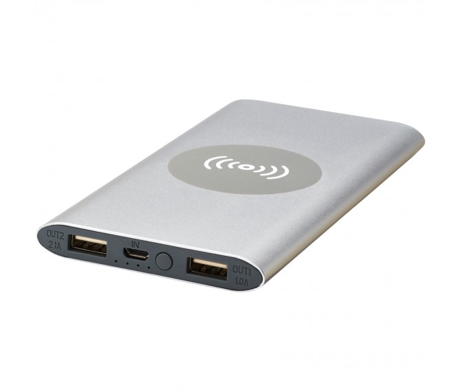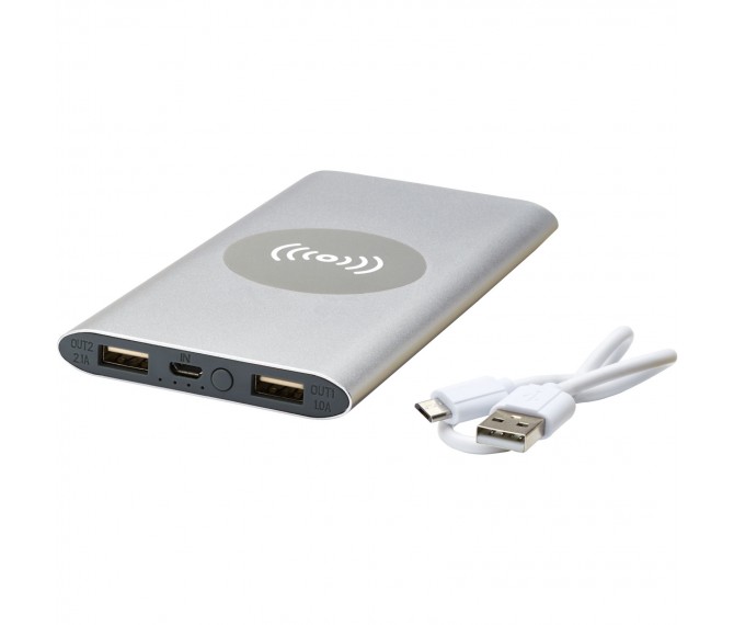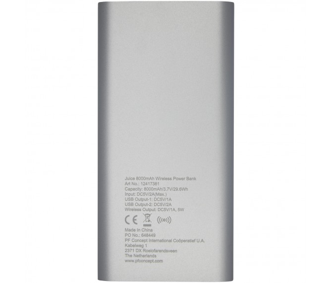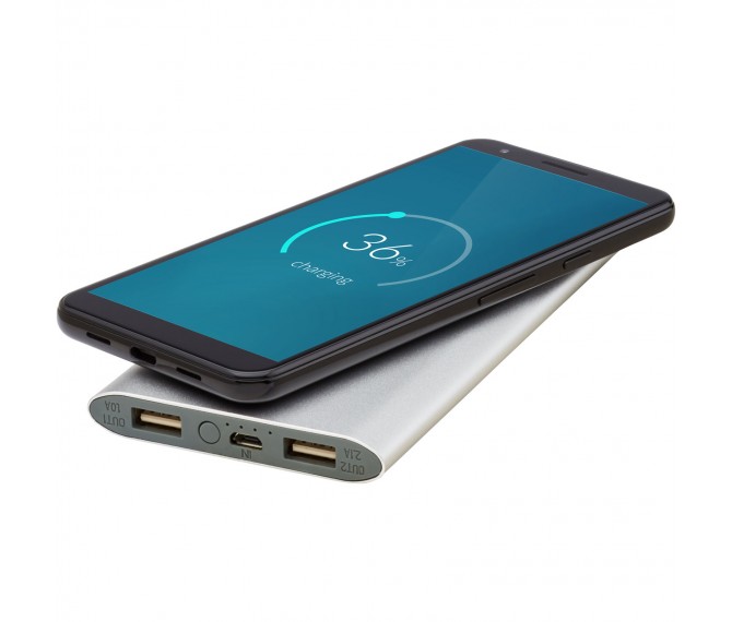 8000 mAh powerbank met aluminium behuizing. Ondersteunt 5 W draadloos opladen en wordt ook geleverd met Micro USB-uitgang om te kunnen opladen met een kabel. Met de lithiumpolymeerbatterij van 8000 mAh kan hij een smartphone meerdere keren volledig opladen. Powerindicator die te allen tijde het energieniveau weergeeft. Micro USB-ingang: 5 V/2 A-uitgang: 5 V/2A. Draadloze uitgang 5 W. Inclusief PVC-vrije TPE kunststof oplaadkabel. Geleverd in een standaardgeschenkverpakking.