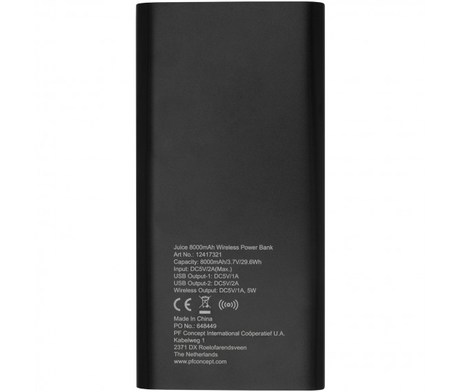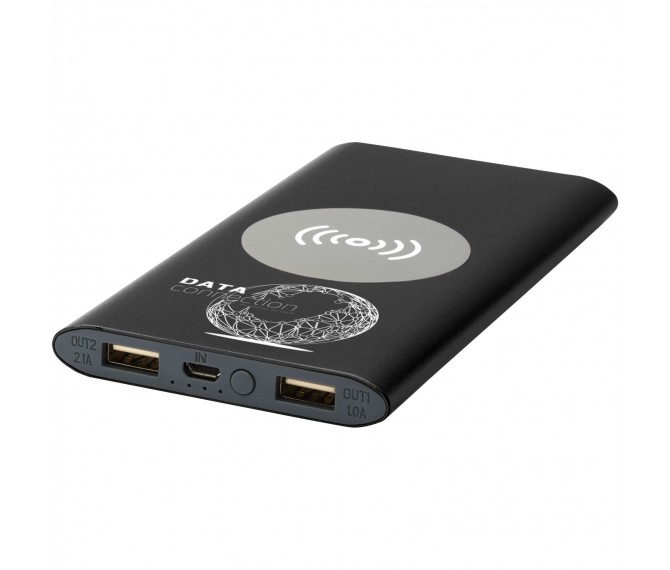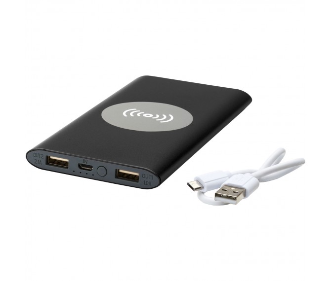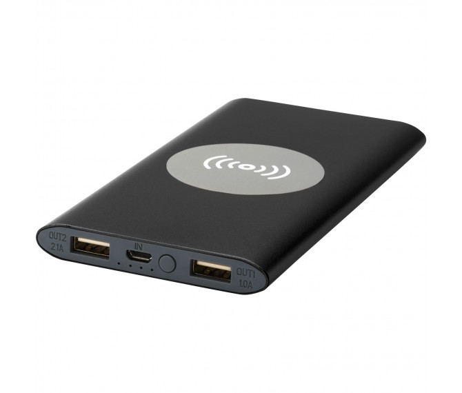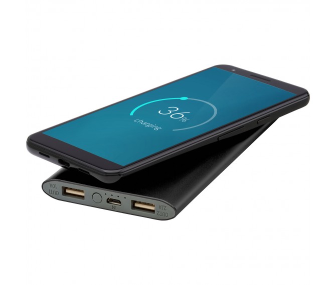 8000 mAh powerbank met aluminium behuizing. Ondersteunt 5 W draadloos opladen en wordt ook geleverd met Micro USB-uitgang om te kunnen opladen met een kabel. Met de lithiumpolymeerbatterij van 8000 mAh kan hij een smartphone meerdere keren volledig opladen. Powerindicator die te allen tijde het energieniveau weergeeft. Micro USB-ingang: 5 V/2 A-uitgang: 5 V/2A. Draadloze uitgang 5 W. Inclusief PVC-vrije TPE kunststof oplaadkabel. Geleverd in een standaardgeschenkverpakking.