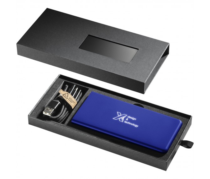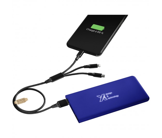 Superdunne en ultra-lichtgewicht rubberen powerbank met oplichtend logo en een 3-in-1 RPET kunststof kabel (Type C, Android, iPhone). Het apparaat licht door de "schudfunctie" op wanneer het wordt aangeraakt en het logo kan maximaal 20 dagen verlicht blijven zonder dat de batterij wordt opgeladen. Capaciteit: 5000 mAh. DC dubbele uitgang: 5 V/2 A en 5 V/2 A snel opladen. DC-ingang: 5 V/2 A micro USB. Nettogewicht: 110 gram. Afmetingen: 138 x 66 x 8,5 mm. Geleverd in een geschenkverpakking gemaakt van gerecycled papier.