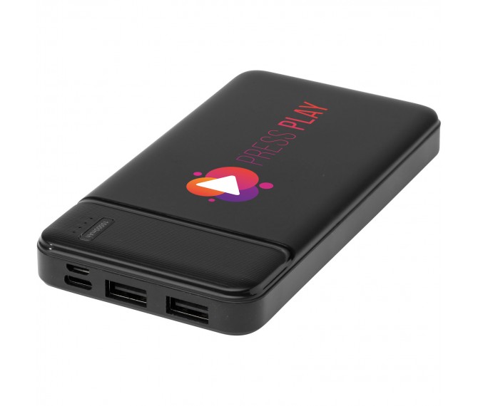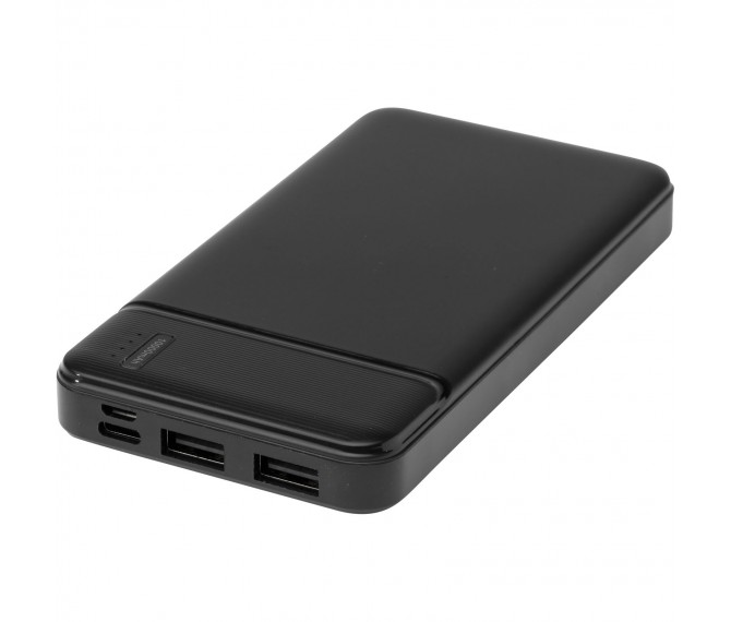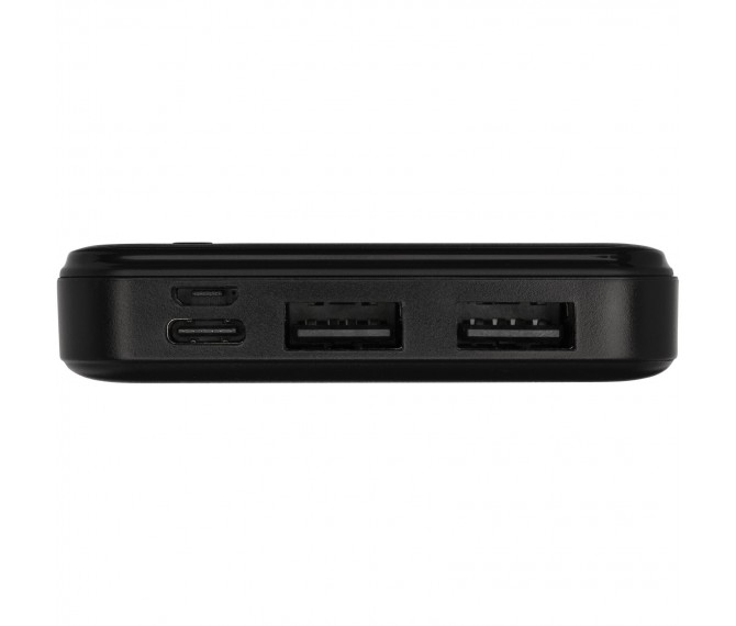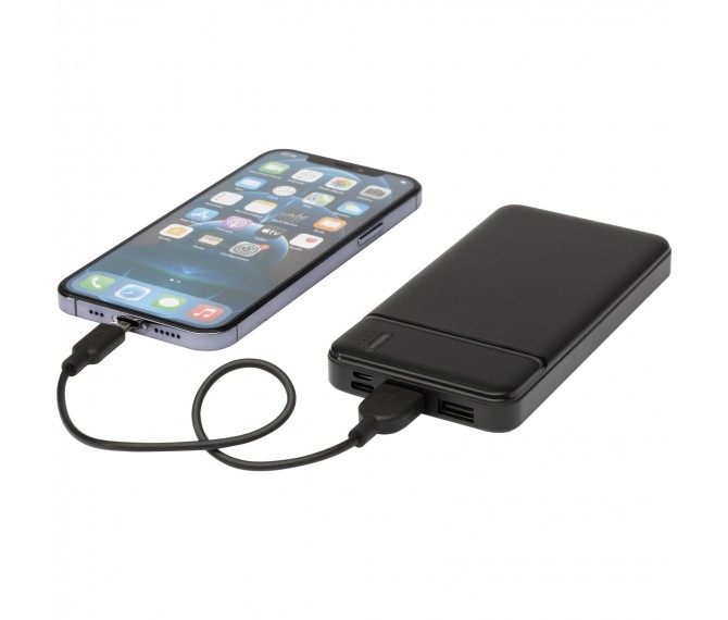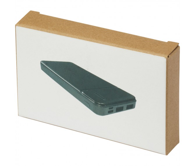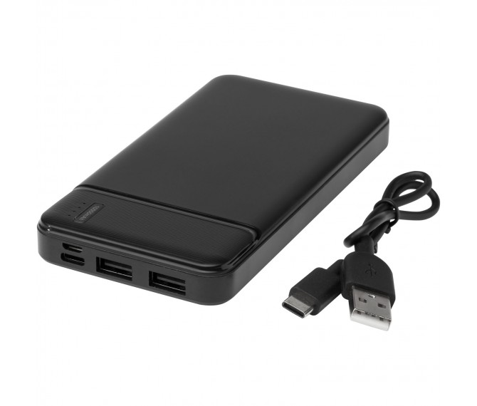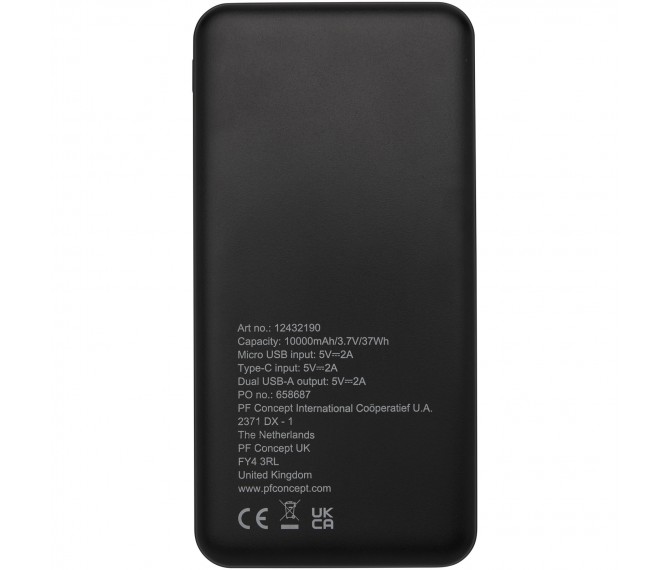 Powerbank gemaakt van gerecycled ABS plastic. De powerbank bevat een duurzame 10.000 mAh lithiumpolymeerbatterij van duurzaam A 10.000 mAh voor snel opladen. De stroomindicatoren geven het resterende energieniveau aan, zodat je altijd weet wanneer je moet opladen. Type-C-ingang 5 V/2 A, Micro-USB-ingang 5 V/2 A, dubbele USB-A-uitgang 5 V/2 A, totaal vermogen 10 W. Geleverd met een 30 cm TPE 2A USB-A naar type-C-oplaadkabel, een handleiding en een geschenkverpakking van kraftpapier.