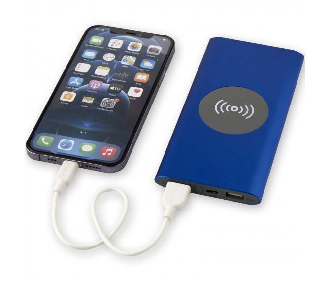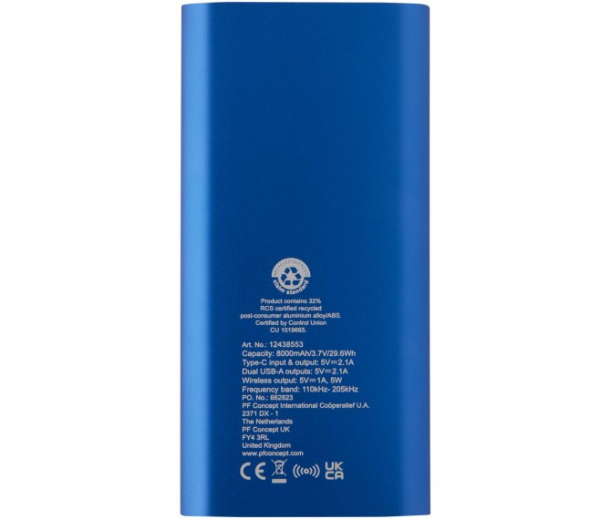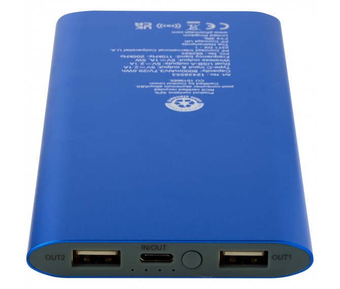 Powerbank met Type-C in/uitgangspoort en 2 x USB-A-poorten, wat betekent dat drie apparaten tegelijk kunnen worden opgeladen. Het ondersteunt ook 5 W draadloos opladen voor alle apparaten met Qi. De powerbank heeft een 8000 mAh lithium-polymeerbatterij die een totaal uitgangsvermogen levert van max. 10 W. Deze powerbank is gemaakt van 28% RCS gecertificeerd gerecycled plastic. Geleverd met een TPE Type-C naar USB-A-oplaadkabel.