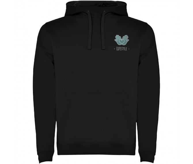 Tweekleurige hoodie met dubbele stof, contrasterend verstelbaar trekkoord, versterkte bedekte naden in de kraag en kangoeroezak. 1x1 elastaan rib in manchetten en tailleband. Verwijderbaar etiket. Het model is 185 cm en draagt maat M.