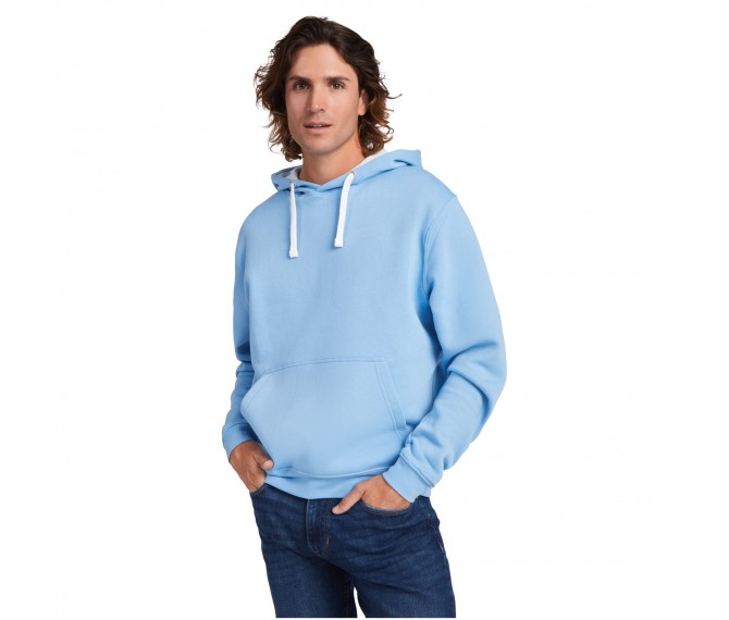 Tweekleurige hoodie met dubbele stof, contrasterend verstelbaar trekkoord, versterkte bedekte naden in de kraag en kangoeroezak. 1x1 elastaan rib in manchetten en tailleband. Verwijderbaar etiket. Het model is 185 cm en draagt maat M.