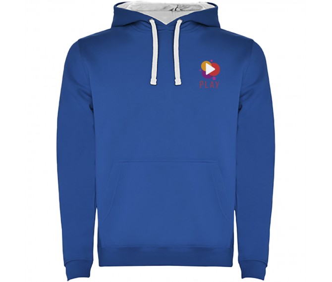 Tweekleurige hoodie met dubbele stof, contrasterend verstelbaar trekkoord, versterkte bedekte naden in de kraag en kangoeroezak. 1x1 elastaan rib in manchetten en tailleband. Verwijderbaar etiket. Het model is 185 cm en draagt maat M.
