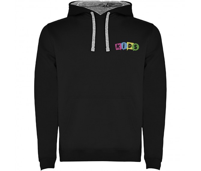 Tweekleurige hoodie met dubbele stof. Versterkte bedekte naden in de kraag en kangoeroezak. 1x1 elastaan rib in manchetten en tailleband. Verwijderbaar etiket. Het model is 120 cm en draagt maat 5/6.