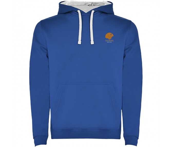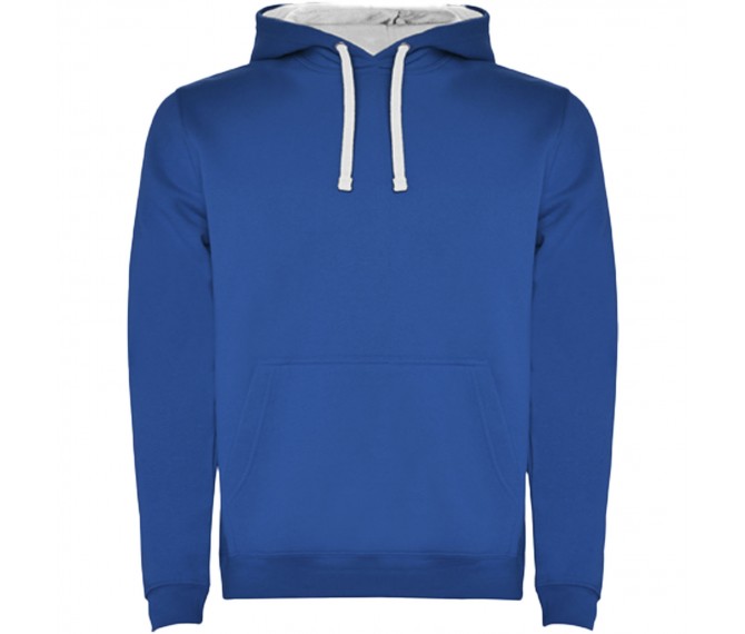 Tweekleurige hoodie met dubbele stof. Versterkte bedekte naden in de kraag en kangoeroezak. 1x1 elastaan rib in manchetten en tailleband. Verwijderbaar etiket. Het model is 120 cm en draagt maat 5/6.