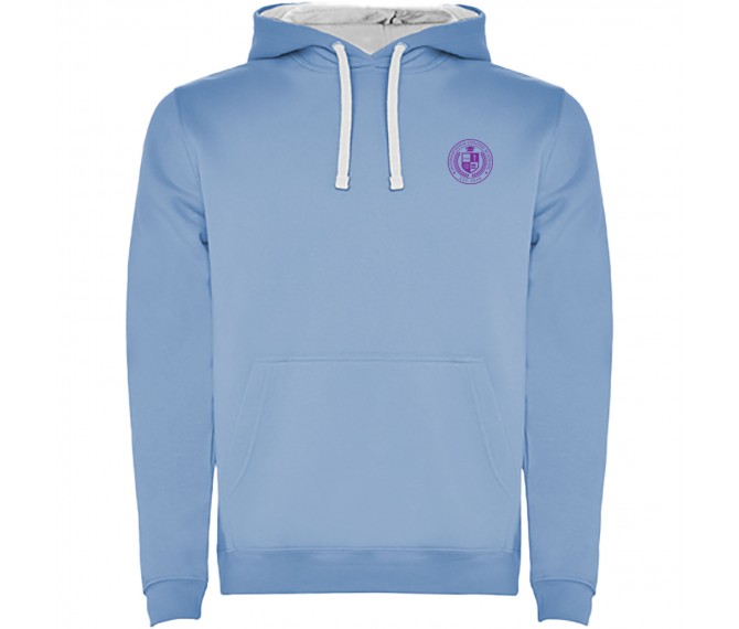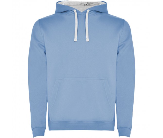Tweekleurige hoodie met dubbele stof. Versterkte bedekte naden in de kraag en kangoeroezak. 1x1 elastaan rib in manchetten en tailleband. Verwijderbaar etiket. Het model is 120 cm en draagt maat 5/6.