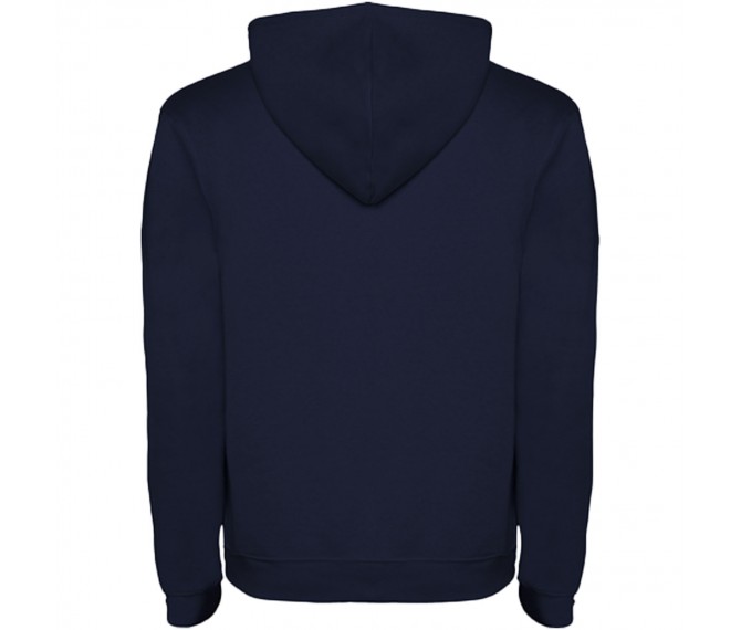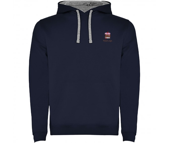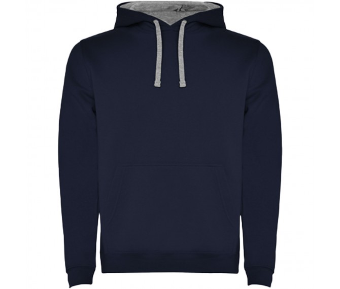 Tweekleurige hoodie met dubbele stof. Versterkte bedekte naden in de kraag en kangoeroezak. 1x1 elastaan rib in manchetten en tailleband. Verwijderbaar etiket. Het model is 120 cm en draagt maat 5/6.