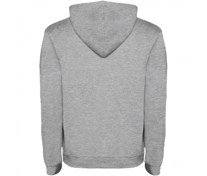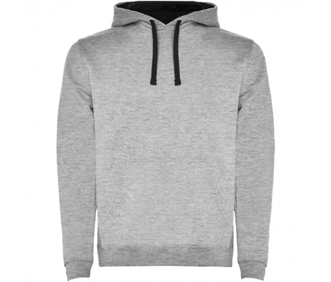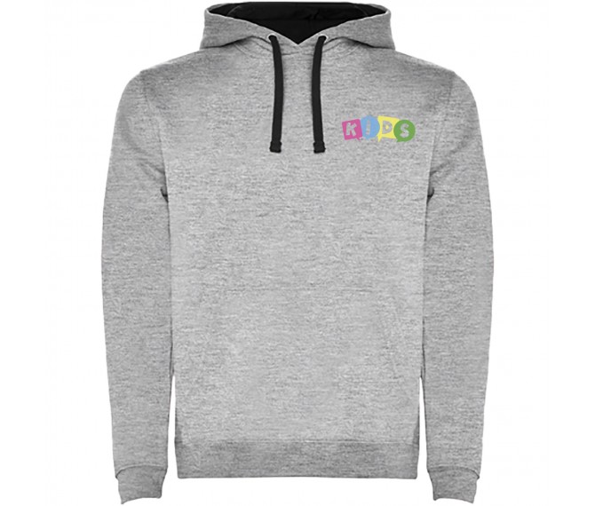 Tweekleurige hoodie met dubbele stof. Versterkte bedekte naden in de kraag en kangoeroezak. 1x1 elastaan rib in manchetten en tailleband. Verwijderbaar etiket. Het model is 120 cm en draagt maat 5/6.