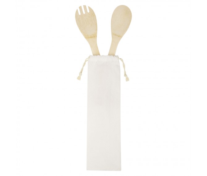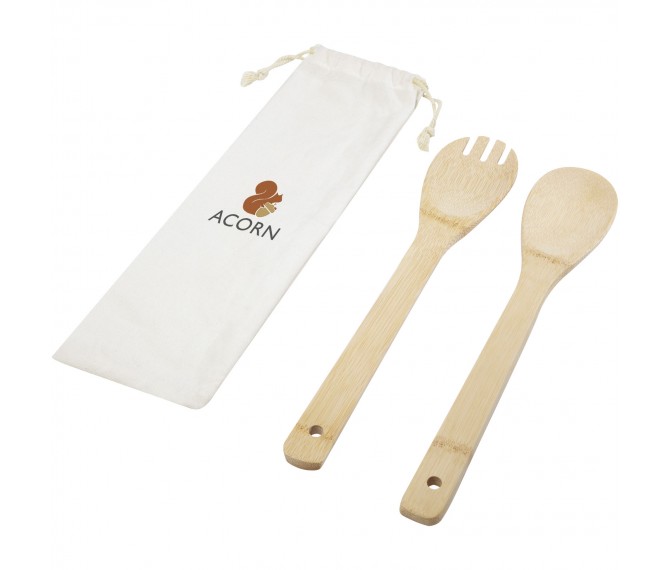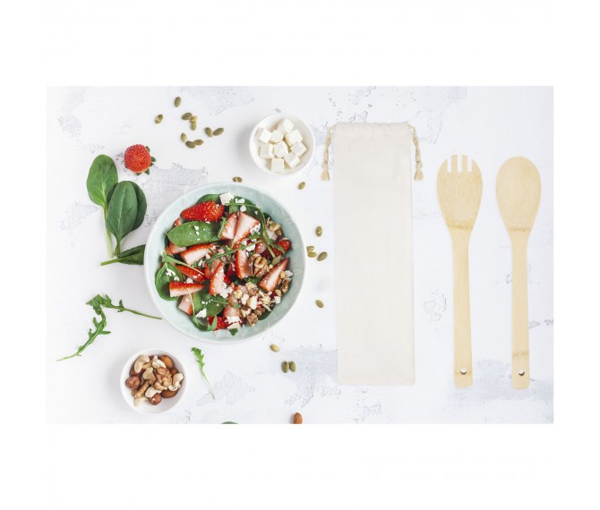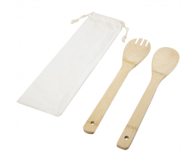 Set met een saladelepel en vork van bamboe, die handig is voor alledaagse familiediners. De gebruikte bamboe wordt ingekocht en geproduceerd volgens duurzame normen.