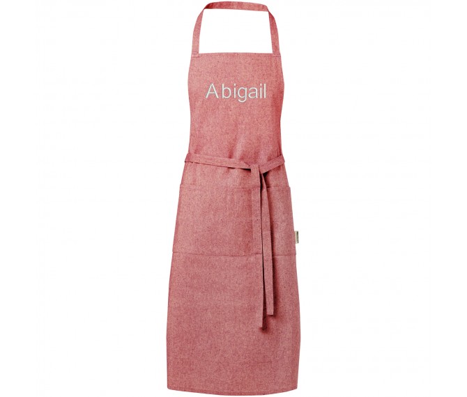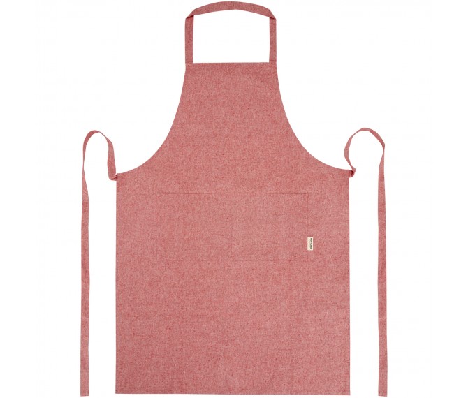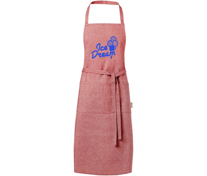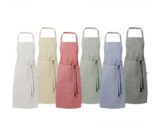 Schort gemaakt van een mix van gerecycled katoen en polyester van 200 g/m². Beschikt over 2 aangrenzende zakken met een gecombineerde afmeting van 45 x 20 cm en een bandsluiting van 1 meter aan de achterkant. Gerecycled katoen wordt vervaardigd uit voor consumenten bestemd afval dat in textielfabrieken tijdens het snijproces wordt geproduceerd. Door de aard van het productieproces kunnen er kleine variaties zijn in de kleur van het daadwerkelijke product. Lengte van de nekband: 55 cm.