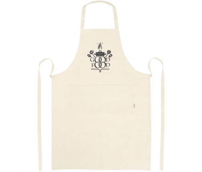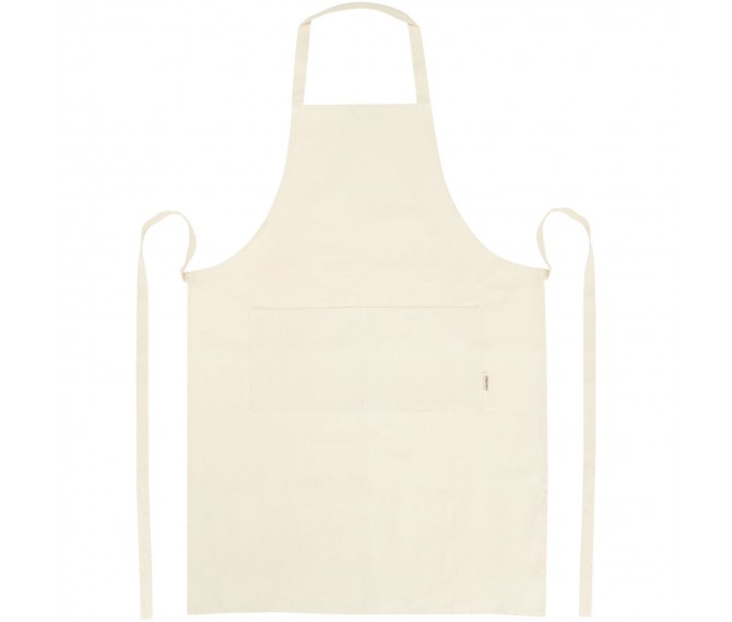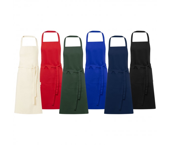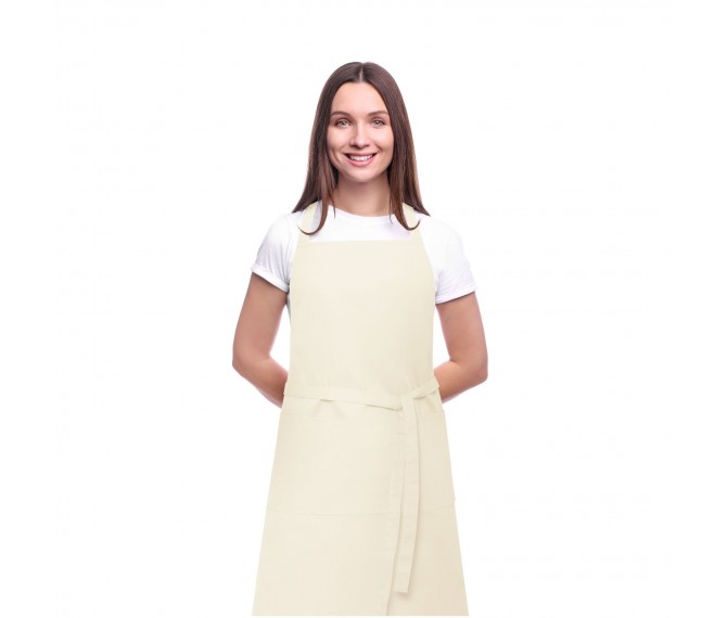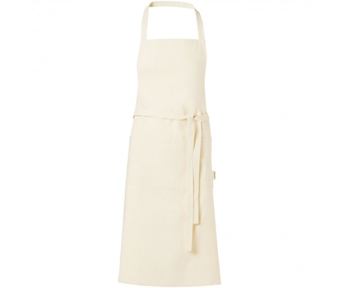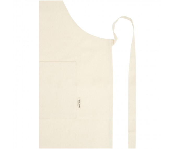 Duurzaam schort van 200 g/m² organisch katoen. Beschikt over 2 aangrenzende zakken met een gecombineerde afmeting van 45 x 20 cm en een bandsluiting van 1 meter aan de achterkant. Lengte van de nekband: 55 cm.